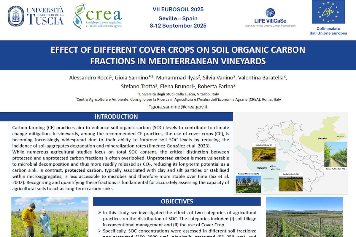 The first project poster presented by CREA-AA at EUROSOIL2025 conference in Seville last September is now available for download. The study, based on the first data collected within the LIFE VitiCaSe project, is focused on the assessment of the effect of cover crops on the stability of different forms of soil organic carbon.